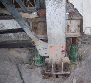 由于礦井凍結法施工造成后期井口附房產生較大沉降,影響了上部結構的使用。采用頂升法對鋼結構廠房中的沉降較大的鋼柱進行糾偏,該方面需要在鋼柱腹板上焊接鋼牛腿提供頂升支點,同時對鋼柱底部預埋的螺栓桿體加長,每個鋼柱兩側設置兩個頂升千斤頂,經過頂升糾偏后該鋼結構廠房基本恢復原狀