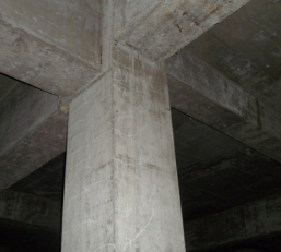我所技術人員于2013年7月赴現場進行了檢測,檢測結果表明,車庫中心位置上浮位移值最大,上浮后柱底最大高層超過20cm。框架柱在上浮位移產生的附加軸力及附加彎矩的作用下,產生了開裂及壓碎現象(圖3、圖4)。框架梁端側面部出現了剪切斜裂縫、梁端底部出現水平裂縫(圖5),特別是車庫與高層住宅交界位置,梁端開裂較為明顯。在車庫頂梁板與車庫外周擋土墻交界位置處附加彎矩的作用下,除梁端裂縫外,擋土墻在梁底標高以下位置出現通長水平裂縫。沿車庫平面跨中位置車庫平面縱向,車庫頂板出現兩條通長裂縫;車庫入口處沿車庫平面橫向,車庫頂板同樣出現兩條通長裂縫,頂板裂縫均與上浮位移較大軸線相對應。