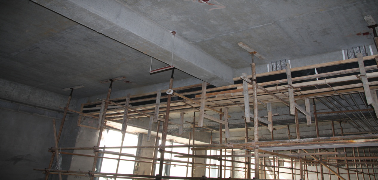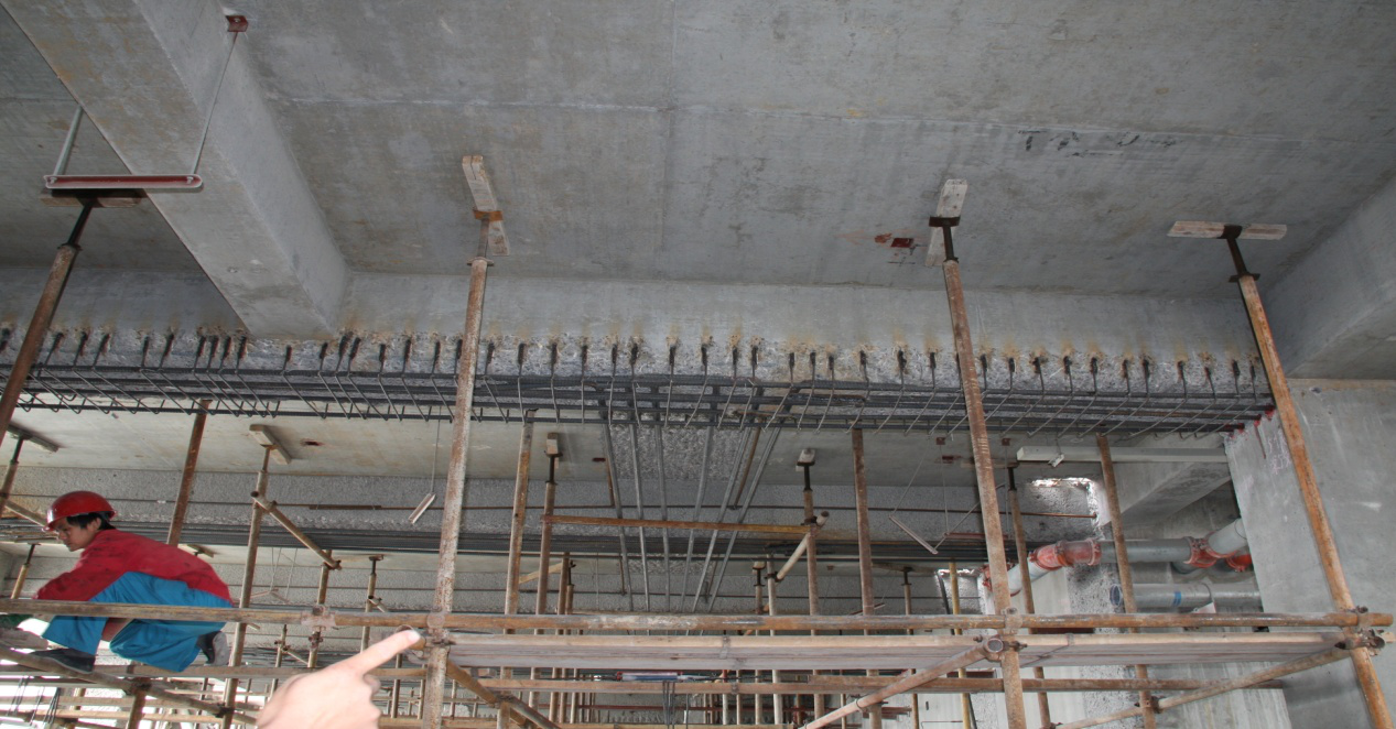 依據加固設計施工圖紙,本工程采用的主要加固施工方法:腳手架支撐卸荷、梁加大截面、柱加大截面、新加框架梁等。主要施工工藝:混凝土界面剔鑿、化學植筋、特種混凝土澆灌等。特種專業施工材料:喜利得HILTI HIT-RE 500錨固劑、北京聯合榮達RG灌漿料。
