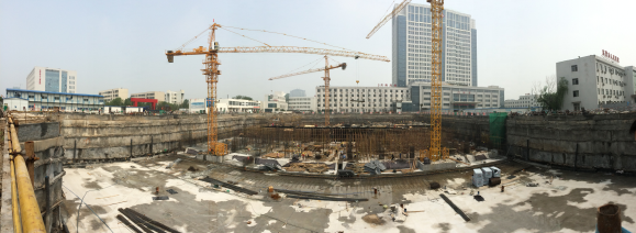 擬建工程為東營市人民醫院急診急救中心暨內科病房綜合樓,基坑整體式開挖,北側裙樓部位開挖深度約11.7m,裙樓以南開挖深度約11.9m。基坑南北向長約123m,東西向寬約87m。