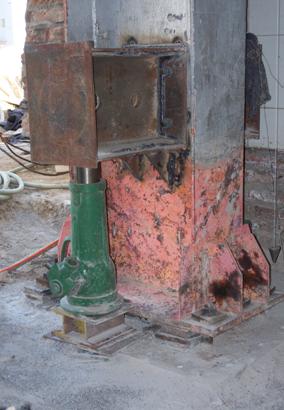 由于礦井凍結(jié)法施工造成后期井口附房產(chǎn)生較大沉降,影響了上部結(jié)構(gòu)的使用。采用頂升法對鋼結(jié)構(gòu)廠房中的沉降較大的鋼柱進行糾偏,該方面需要在鋼柱腹板上焊接鋼牛腿提供頂升支點,同時對鋼柱底部預(yù)埋的螺栓桿體加長,每個鋼柱兩側(cè)設(shè)置兩個頂升千斤頂,經(jīng)過頂升糾偏后該鋼結(jié)構(gòu)廠房基本恢復(fù)原狀。