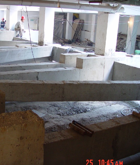 該建筑為8層框架,建筑面積5240m2,總重量約65000kN,采用柱雙梁式托換結構,滾動式平移技術。