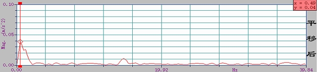 平移后的測試結果:根據實測的實時譜曲線,平移后二層樓面振動測點的主頻為0.49HZ(振動周期2.04s)。