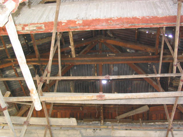 小廣寒影劇院原結(jié)構(gòu)為磚、石、木、鋼混和結(jié)構(gòu)。墻體由亂石、粘土磚用粘土、石灰雜砌而成,中間為鋼柱-鋼梁支撐,屋架為木結(jié)構(gòu),屋面為鐵皮屋面。室內(nèi)頂棚為板條麻刀粘土石灰頂棚,隔墻為木柱、木腰梁半磚隔墻??磁_(tái)為木結(jié)構(gòu)看臺(tái),木樓梯。小廣寒影劇院因年久失修,磚石墻、屋架、看臺(tái)、隔墻等大部分已破損、腐爛。本次修繕工作本著“修舊如舊”的原則,對(duì)建筑物進(jìn)行了針對(duì)性的改造加固。