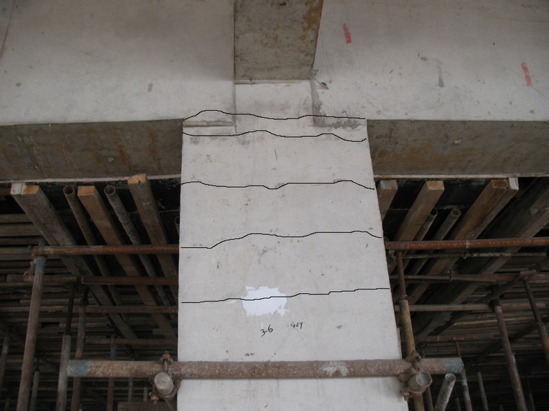 主體結構現已封頂,在2014年元旦左右,拆除E區一二層頂BDF大板模板后,發現一層~三層頂大板四周柱與相關梁出現不同程度的裂縫,隨之二層頂BDF大板也出現板底裂縫。