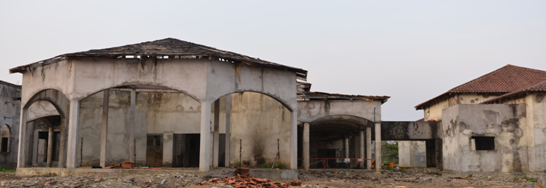 伊豐度總統行宮項目為2006年剛果(布)國慶配套工程,占地101200m2,由一個主樓加上兩個單層別墅組成。其中1#主樓建筑面積為2700 m2,主體為一層、局部二層,一層層高約為5米,大廳處層高約為8米,結構形式為混凝土柱、梁及150厚空心砌塊墻承重,木屋頂結構(局部現澆板屋頂),見圖32~35。現大部分圖紙缺失,混凝土強度等級、砌體材料強度等級不詳。該國建筑物不考慮抗震設防要求。2006年由本地建筑單位承建,由于各種原因中途停工至今,現剛果(布)大工委指派威海國際經濟技術合作股份有限公司進行維修與續建,項目組對現狀進行勘察后發現該工程施工質量差,且長時間暴曬雨淋導致屋架腐爛、梁柱板鋼筋嚴重銹蝕,存在重大安全隱患,為保證結構安全,委托我所對該工程進行鑒定并出具加固方案。